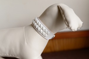 こちらは四角いスタッズが1cm四方のものを2つ並べて制作をし、首に当たる部分にもう一枚革を張り合わせて首に傷を付けないように配慮したものです。